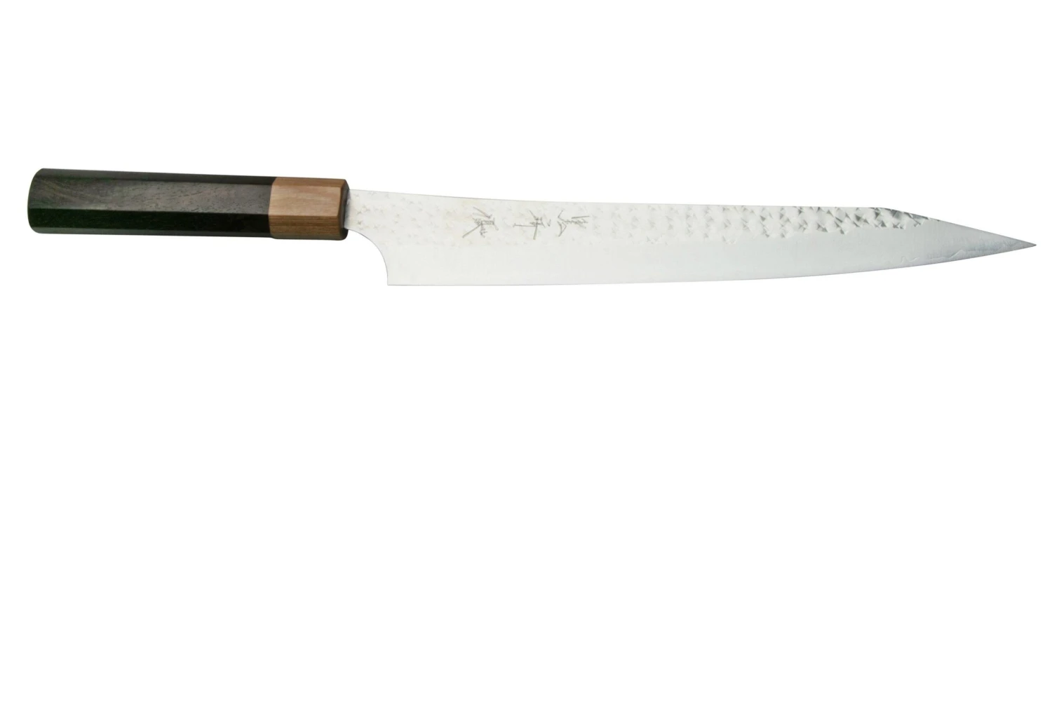 Cet Eden Takara Sujihiki est l’alternative du Yanagiba à double tranchant. Idéal pour trancher les poisson et la viande. Surtout évitez d’approcher arrêtes ou os de ce couteau car ils l’endommageraient. Grace à son tranchant supérieur c’est un grand plaisir de travailler avec ce couteau qui est de plus un vrai régal pour le yeux.