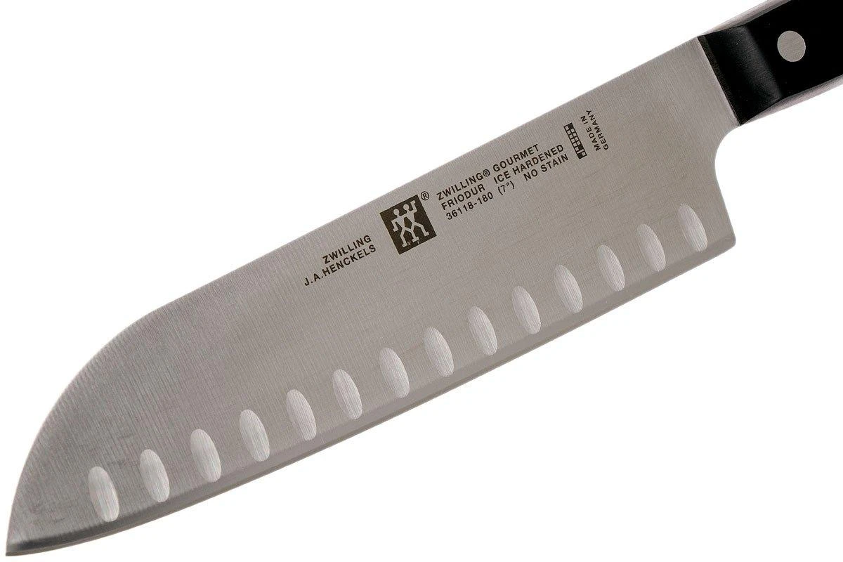 Le santoku Zwilling Gourmet avec alvéoles est le couteau de cuisine par excellence pour toutes tâches de coupe. Le santoku est un couteau de chef japonais nommé après trois tâches culinaires : hacher, couper en morceaux et couper finement. Le santoku est donc parfait pour préparer de la viande, du poisson et des légumes. Les alvéoles permettent à l’air de pénétrer entre la lame et les aliments de sorte à ce qu’ils ne collent pas à la lame. La lame haute permet de facilement déplacer les ingrédients directement dans la poêle. Ce couteau fait partie de la gamme Zwilling Gourmet. Une large gamme de couteaux de cuisine avec un design classique à trois rivets.